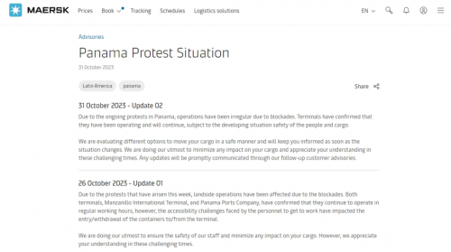 马士基10月30日发布公告警告:“由于巴拿马持续不断的抗议活动,运营因封锁而变得不正常。”