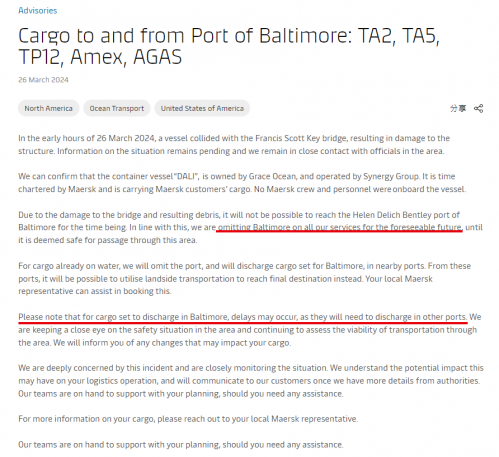 “由于桥梁受损并产生碎片,使得船只暂时无法到达巴尔的摩海伦·德利希·本特利港(Helen Delich Bentley)。据此,在可预见的将来,我们所有航线服务都将跳过巴尔的摩港,直到认为通过该地区是安全的。”